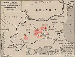 ![]() Regions involved in the Stara Zagora and April revolts. The borders of the Bulgarian Principality, according to the Constantinople Conference of 1876, are indicated. | |||||||