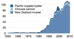 Aquaculture started to take off in New Zealand in the 1980s. It is dominated by mussels, oysters and salmon.[2] In 2007, aquaculture generated about NZ$360 million in sales on an area of 7,700 hectares. $240 million was earned in exports.[3][4]