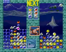 Aquarium is a Tetris variant puzzle arcade game released by Excellent System in 1996 in Japan only. Play consists of matching three fish shapes rows to make them disappear.