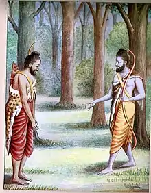 Rama tells Shabari the Ninefold devotion, which he asks her to listen with caution and keep in mind. The first devotion is the company of righteous. The second is love for my legends. Serving Guru's lotus feet without ego is the third devotion. The fourth devotion is guileless singing of my qualities. Recitation of mantras and firm faith in me is the fifth devotion that is enlightened by the Vedas. The sixth devotion is being well-mannered, detachment from various Karma and conscientious persistence in goodness. The seventh devotion is seeing me pervading the whole world without prejudice and regarding righteous even above Me. The eighth devotion is contentment in what one gets and even in dreams not to see fault in others. The ninth devotion is simplicity, guileless behaviour towards all and trust in me without joy or sorrow in heart. Out of nine even one who has that woman or man is extremely dear to me.
