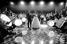 In a strict Muslim families, men may not dance with women or even watch women in unmodest dresses. So only the female guests and children enter the hall together with the wedding couple. Also photographers and other personnel must be women, the DJ, if male, has to operate behind a closed door. Men wait outside in a separate room or garden. At the end of the party women cover their shoulders and male family members may enter the hall. Family by family visit the couple to offer congratulations and money presents. At the end they may dance together.