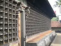 The temple is built in Kerala style architecture, which is common in all temples in the South Indian state of Kerala in eastern axis. The temple has an elevated structure reached by a flight of 20 steps. The temple has a two-storeyed gopuram or a gateway tower, with the upper storey having wooden trails covering the Kottupura (a hall of drum beating during festivals). A rectangular wall around the temple, called Kshetra-Madilluka, pierced by the gateways, encloses all the shrines of the temple. The metal plated flagpost or Dwajasthambam is located axial to the temple tower leading to the central sanctum and there is a Deepastamba, which is the light post. Chuttuambalam is the outer pavilion within the temple walls. The central shrine and the associated hall is located in a rectangular structure called Nallambalam, which has pillared halls and corridors.[9] Between the entrance of Nalambalam to the sanctum, there is a raised square platform called Namaskara Mandapa which has a pyramidal roof. Thevrapura, the kitchen used to cook offering to the deity is located on the left of Namaskara Mandapa from the entrance. Balithara is an altar is used for making ritualistic offering to demi-gods and the festive deities. The central shrine called Sreekovil houses the image of the presiding deity, who is a standing four-armed Lord Vishnu worshipped as Parthasarathy. It is on an elevated platform with a single door reached through a flight of five steps. Either sides of the doors have images of guardian deities called Dvarapalakas. As per Kerala rituals, only the main priest called Thantri and the second priest called Melshanthi alone can enter the Sree Kovil.[10] The central shrine has a circular plan with the base built of granite, superstructure built of laterite and conical roof made of terracotta tile supported from inside by a wooden structure. The lower half of Sree Kovil consists of the basement, the pillar or the wall, called stambha or bhithi and the entablature called prasthara in the ratio 1:2:1, in height. Similarly the upper half is divided into the neck called griva, the roof tower called shikhara and the conical kalasam (made of copper) in the same ratio. The roof projects in two levels to protect the inner structure from heavy rains during monsoon. The roof of the temple and some of the pillars have lavish wood and stucco carvings depicting various stories of ancient epics, Ramayana and Mahabharatha.[11] The outer walls around the sanctum have a series of wooden frames housing an array of lamps, which are lit during festive occasions.[12] The temples have paintings on its walls dating back to early 18 century.[13] The image of the presiding deity is 6 ft (1.8 m) tall, making it the tallest among the idols of all Krishna temples in Kerala. Krishna is in Vishvarupa pose, the one he depicted to Arjuna during the Mahabharatha war. It is thus considered to be in fierce form. As per one legend, Arjuna is believed to have built the temple in Nilakal Narayanapuram and later brought to Aranmula in a raft made with six bamboo.[7] In the second precinct, there are shrines of Sastha, Yakshi, Nagaraja and Erangavil Bhagavathy Balarama in the lower shrine.[7]