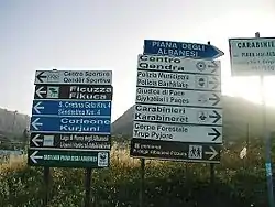 In certain communes the local authorities support cultural and linguistic activities promoted by the Arbëresh communities and have agreed to the erection of bilingual road signs.[19] There are associations that try to protect the culture, particularly in the Province of Cosenza. The Arbëresh language is used in some private radios and publications. The fundamental laws of the areas of Molise, Basilicata and Calabria make reference to the Arbëresh language and culture. Nevertheless, the increase in training in the use of the written language has given some hope for the continuity of this culture.