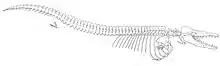 Of the less than 10 fossils that have been described, one, Ambulocetus natans, is nearly complete and the main source of information concerning early cetacean evolution. The size of a male sea lion, it had a large head with a long snout and robust, strongly worn teeth. The lower jaw shows that Ambulocetus had an unusual soft tissue connecting the back of the jaw to the middle ear — a small equivalent to the large sound-receiving fat pad in modern odontocetes. Its eyes were placed dorsally on the head, but were facing laterally. The musculature of the head, neck, and back was strong and the fluke-less tail was long. The hind limbs were short, but equipped with long feet. The fore limbs were also short and equipped with five short hooves. Ambulocetus probably swam with its hind feet like a modern otter, and was incapable of supporting its own weight on land. It probably was an ambush hunter like modern crocodiles.[2]