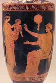 The museum has a black-figure epinetron from Amarynthos dated to the end of the 6th century BC. The funerary amphora, depicting geometric patterns and birds, contained the bones of a child and is a product of a local Euboean workshop of the Geometric period, dated to the 8th century BC.[1] There are also many more amphoras and vases, including a funerary amphora from the coastal necropolis of Eretria dated to 560 BC which depicts the battle between Herakles and Centaurs on the front and Potnia Theron (Mistress of the Animals) on the rear, and a Panathenaic amphora dated to around 363-362 BC.[1] The front side of the amphora depicts the armed goddess Athena, while the rear illustrates a scene from the Panathenaic contest for which the vase was the prize.[1] Also is the terracotta gorgoneion dated from the 4th century BC which belonged to the decoration of the House with the Mosaics at Eretria.[1]