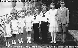 By Alfonso's invitation, they took up residence in Palacio Uribarren at Lekeitio in the Bay of Biscay. For the next six years Zita settled in Lekeitio, where she got on with the job of raising and educating her children. Their lessons were under a strict regime, with the greatest volume applying to Otto, and decreasing by age, so that Elisabeth had the smallest workload.[2] Their mother loved to have them all photographed in a line by height, with Otto (the tallest) at one end and Elisabeth (the shortest) at the other end.[3] They lived with strained finances, mainly living on income from private property in Austria, income from a vineyard in Johannisberg, and voluntary collections. Other members of the exiled Habsburg dynasty, however, claimed much of this money, and there were regular petitions for help from former Imperial officials.