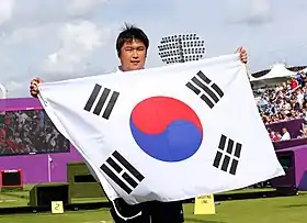 ![]() Gold medallist Oh Jin-hyek holds the flag of South Korea following his victory | |||||||||||||