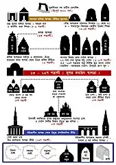These features are also seen in the Choto Sona Mosque (around 1500), which is in stone, unusually for Bengal, but shares the style and mixes domes and a curving "paddy" roof based on village house roofs made of vegetable thatch. Such roofs feature even more strongly in later Bengal Hindu temple architecture, with types such as the do-chala, jor-bangla, and char-chala.[14] For larger mosques, Bengali architects multiplied the numbers of domes, with a nine-domed formula (three rows of three) being one option, surviving in four examples, all 15th or 16th century and now in Bangladesh,[15] although there were others with larger numbers of domes.[16]
