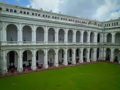 The Victoria Memorial in Calcutta is the most effective symbolism of British Empire, built as a monument in tribute to Queen Victoria's reign. The plan of the building consists of one large central part covered with a larger dome. Colonnades separate the two chambers. Each corner holds a smaller dome and is floored with marble plinth. The memorial stands on 26 hectares of garden surrounded by reflective pools.[85]