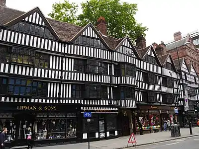 One of the significant developments of Tudor architecture was the increased use of red brick, a building material that became more readily available due to technical innovations in the late 15th century.[23] Examples of this can be seen in the form of Bruce Castle (c.early 16th century): believed to be one of the oldest brick houses in England, the gatehouse of Lambeth Palace (1495) and St James's Palace (1536). Tudor architecture however is most closely associated with its distinctive vernacular buildings which were typically timber framed and filled with wattle and daub giving the building a black and white 'checkerboard' appearance. Most commercial and residential buildings in London before the great fire resembled this from. Only a tiny handful of such buildings survive to this day including Staple Inn: an Inn of Chancery dating back to the Tudor period, 41 Cloth Fair: central London's oldest house started in 1597 and Prince Henry's Room: a timber-framed jettied townhouse built in 1610. Although the vast majority of such structures were destroyed in the Great Fire of London many timber-framed houses did, in fact, survive until as late as the late 19th and early 20th centuries but were demolished to make way for new development.[24] A famous example of this is the demolition of Wych Street in the Edwardian period to make way for Kingsway, a new road built between the Strand and High Holborn.