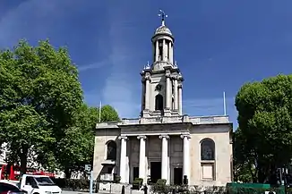 The 51 city churches (25 of which survive today) designed by Wren and his team are also of great architectural significance. Stylistically they are very eclectic and inventive designs that were often built on very small and limiting sites. The towers of the churches are the most architecturally notable and inventive feature of the church exteriors. Perhaps the most notable examples are the unusual tiered spire of St Bride's Fleet Street the tallest of the city churches and the famous tower of St-Mary-le-bow, an inventive mixture of classicism and gothic. Stylistically most of the churches are not purely baroque in their style, the most notable exception being St Stephen's Walbrook with its fine domed interior.[29] Many of the churches such as St Peter Upon Cornhill showcase a strong influence from Dutch classicism and Palladianism, whereas others like St Mary Aldermary are purely neo-gothic recreations of the former medieval churches, complete with a fan vaulted ceiling harking back to the perpendicular gothic of the late Middle Ages. Despite the architectural merit of these individual buildings, perhaps the most significant achievement of Wren's reconstruction of St Paul's and the city churches was their overall interaction as an ensemble. Observing Canaletto's views of the City of London painted in 1750, one can see how St Paul's and the City Churches soar prominently above the rest of the city as a result of the tightly restricted height of all new domestic and commercial buildings in the city. The result is a highly picturesque skyline whose beauty astounded visitors to the newly reconstructed city.[27] And so paradoxically, the great catastrophe that was the Great Fire of London can be considered in hindsight to have given a great new lease of life to London, as it gave a much-needed opportunity drastically improve and modernise the city. In the words of the architectural historian Dr Simon Thurley: