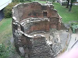 The rectangular walled and gridded city was soon extended to the west over the River Walbrook, north towards marshy Moorfields and east to the area later known as Minories,[11] where a Romano-British tomb sculpture of an eagle was found in 2013, suggesting the site lay outside the city boundary in the early second century.[12] A significant portion of the amphitheatre remains beneath the London Guildhall square and a Roman bathing complex is accessible in the basement of 100 Lower Thames Street.[13] The square Castrum was located at the north-east of the city at the Barbican, close to the Museum of London where significant sections of the Roman London Wall remain. For centuries afterward, distances from London were reckoned from the London Stone, claimed in the past to be a fragment of ancient masonry from the ancient Thames-side Governor's Palace, though this cannot now be verified.[14] Late Roman private houses of leading Christians are thought to have been the foundation of the earliest churches; mosaic remains in the crypt at All Hallows by the Tower and may also have been present at St Pauls Cathedral – its growing significance over centuries has distorted the once-straight strada on which the site once stood.