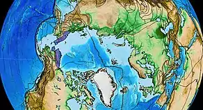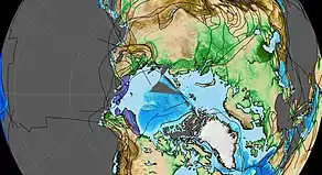 The Proterozoic–Carboniferous histories of Arctic Alaska and Chukotka are similar but their Triassic–Jurassic histories are apparently distinct. Whether or not they were separate blocks before the Mesozoic opening of the Amerasia Basin is disputed.[3] The age of the basement of the AAC remains enigmatic, hence also details about the microcontinent's ancient, tectonic history. It is, nevertheless, clear from Neoproterozoic igneous rocks that the AAC was not originally part of Laurentia, but most likely Baltica. The microcontinent was obviously involved in a series of magmatic events, beginning at c. 1.6–1.4 Ga, and ending in the Avalonia–Cadomian orogeny.[4]