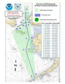 The Coast Guard announced a port access route study of the Bering Strait in the Federal Register on November 8, 2010, with the purpose of soliciting public comments on whether a vessel routing system was needed and if it could increase vessel safety in the area.[10] Following this, on December 5, 2014 the Coast Guard announced its intent to continue the evaluation started in 2010 by expanding the study area to include most of the Bering Sea, proposing a two-way route as a vessel routing system, while creating four Areas to be Avoided (ATBA). It released its final report on February 27, 2017 recommending adoption of Alternatives 1, 4, 5, 6 and 7 and is requesting additional public comments until May 30, 2017 11:59 PM ET.[11]