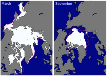 Various projections indicate that the ice floe will greatly diminish in the future, and might even disappear by the end of the century. The depletion of the arctic ice is already visible. On average over a year, the ice floe has diminished by 4.3% every ten years. However, this reduction is not uniform over the entire year. Indeed, if we observe only the month of September, the ice floe has diminished by 10.7% every ten years, compared to only 2.8% in March. Projection models of the evolution of the arctic ice floe are based on the last 30 years. These projections mainly use circulation models of ocean and atmospheric currents, such as NEMO, the OGCM and the CMIP. They also take into account the evolution of greenhouse gases, such as .[5]
