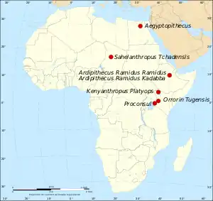Ardipithecus is a genus of an extinct hominine that lived during the Late Miocene and Early Pliocene epochs in the Afar Depression, Ethiopia. Originally described as one of the earliest ancestors of humans after they diverged from the chimpanzees, the relation of this genus to human ancestors and whether it is a hominin is now a matter of debate.[1] Two fossil species are described in the literature: A. ramidus, which lived about 4.4 million years ago[2] during the early Pliocene, and A. kadabba, dated to approximately 5.6 million years ago (late Miocene).[3] Behavioral analysis showed that Ardipithecus could be very similar to chimpanzees, indicating that the early human ancestors were very chimpanzee-like in behavior.[1]