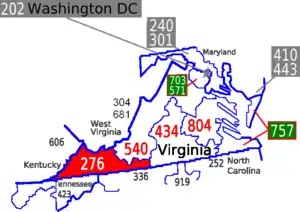 Area code 276 is a telephone area code in the North American Numbering Plan (NANP) for the U.S. state of Virginia. It was established as a split of numbering plan area 540 on September 1, 2001.