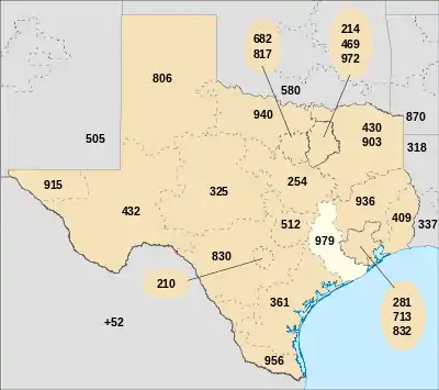 Area code 979 is a telephone area code in the North American Numbering Plan (NANP) for the U.S. state of Texas. The numbering plan area comprises the region generally following the Brazos River found between the Austin and Houston metro areas and its surrounding communities, stretching from just south of Waco to the Gulf Coast. It was created on February 13, 2000, in a split from area code 409.
