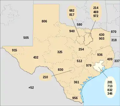 Area codes 713, 281, 832, and 346 are telephone area codes in the North American Numbering Plan (NANP) forming an overlay complex for Houston, Texas and its environs. Area code 713 is one of the original four area codes established for Texas in 1947.