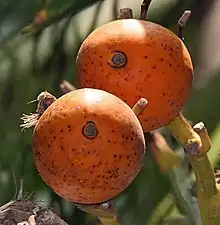 The areca nut tree grows as a single stem, and has generally a height of about 30 metres (98 ft). The fruit, which bears the nut, is orange coloured and is in the shape of an egg or oval shape; it holds a hard single seed.[2]