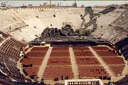 Dance and classic concert performances have also been given in the Arena. Classical ballets and traditional dances from all over the world have been seen. In 1976, Maurice Béjart brought the Ballet du XXe Siècle from the La Monnaie opera house in Brussels and choreographed Beethoven's 9th symphony. This première was interrupted by rain, but the performance continued to a cassette tape of the music and without the orchestra.