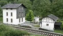 The station buildings form a unique combination of half-timbered and corrugated iron buildings.[8] Like the entire line, this building is also a heritage-listed monument. While the corrugated iron hut serves as a waiting room, a small signal box is housed in the half-timbered building, which is still used today. Due to the lack of funding, this situation will continue to exist at least until 2020, despite increasing structural deficiencies.[9] The station has 400 metre-long platforms, which were raised to a height of 38 cm and paved over a length of 140 metres from October 2011. The platform lighting was also renewed and a waiting room was built.[10]