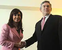 Since the mid-2000s, diplomatic relations between the UK and Argentina have become increasingly strained. In 2006, Argentina renewed claims to the Falkland Islands, citing concern over fishing and petroleum rights.[16] On 28 March 2009, UK Prime Minister Gordon Brown stated that there was "nothing to discuss" with Cristina Kirchner, the Argentine president, over sovereignty of the islands, when they met in Chile on his pre-2009 G-20 London Summit world tour.[17] On 22 April 2009 Argentina made a formal claim to the UN to an area of the continental shelf encompassing the Falklands, South Georgia and South Sandwich Islands, and parts of Antarctica, citing 11 years worth of maritime survey data.[18] The UK quickly protested against these claims.[19]