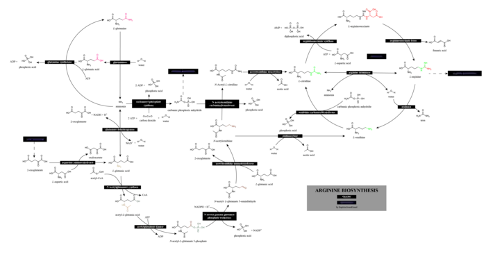 Arginine is synthesized from citrulline in arginine and proline metabolism by the sequential action of the cytosolic enzymes argininosuccinate synthetase and argininosuccinate lyase. This is an energetically costly process, because for each molecule of argininosuccinate that is synthesized, one molecule of adenosine triphosphate (ATP) is hydrolyzed to adenosine monophosphate (AMP), consuming two ATP equivalents.