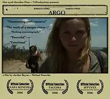 Argo has received recognition while on the festival circuit, screening in 2006 at the Napa Sonoma Wine Country Film Festival, Tacoma Film Festival, the Independent Film Festival of North Texas, and in 2007 at the Sunscreen Film festival,[6] Westchester Film Festival, FilmFest ReLoaded, Pumelo Independent Film Festival,[1] Miami Underground Film Festival, Delray Beach Film Festival, Sedona Film Festival, NewFilmMakers Winter Series,[7] Soho House Screening Series, and the DeREEL Independent Film Festival.[8]