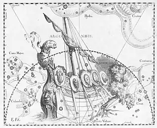 In modern times, Argo Navis was considered unwieldy due to its enormous size (28% larger than Hydra, the largest modern constellation).[1] In his 1763 star atlas, Nicolas Louis de Lacaille explained that there were more than a hundred and sixty stars clearly visible to the naked eye in Navis, and so he used the set of lowercase and uppercase Latin letters three times on portions of the constellation referred to as "Argûs in carina" (Carina, the keel or hull), "Argûs in puppi" (Puppis, the poop deck or stern), and "Argûs in velis" (Vela, the sails).[7] Lacaille replaced Bayer's designations with new ones that followed stellar magnitudes more closely, but used only a single Greek-letter sequence and described the constellation for those stars as "Argûs". Similarly, faint unlettered stars were listed only as in "Argûs".[8]