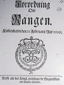 - Older Danish: Forordning Om Rangen, Kiøbenhavn den 13 de Decembr. [sic] Decembr. Ao 1730 Original prints stored at the National Archives in Oslo, Decrees, Posters, etc. (Forordninger, Placater m. v.) 1613–1814. Volume XX, 17–1730, folia 191–194.