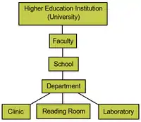 Every Greek public university comprises the faculties and the faculties comprise the schools. A school covers a basic scientific area and thus is considered to be the basic academic unit. Every school is subdivided into departments, which are responsible for the teaching of a specific part of the school's scientific area. Moreover, departments have substantial autonomy in educational matters and therefore they are mainly responsible for planning and implementing educational programs and granting degrees. Finally, clinics, reading rooms and laboratories are smaller units that belong to a department.