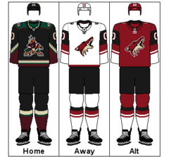Upon their arrival in Phoenix in 1996, the team adopted a look with a strong Southwestern flavor. The primary logo was a stylized hockey stick-wielding coyote in a kachina-inspired style. The jerseys featured pointed green shoulders with brick red trim over a white (home) or black (road) body, and non-traditional striping patterns. These uniforms remained in place until 2003. A third jersey, primarily green with a nighttime desert landscape wrapped around the bottom and the cuffs of the sleeves, was introduced in 1998, and retired in 2003 when the team redesigned the uniforms.