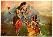 When Arjuna was in deep meditation, a wild boar ran towards him. He realized it and took out an arrow and shot it at the boar. But, another arrow had already pierced the boar. Arjuna was furious and he saw a hunter there. He confronted the hunter and they engaged in a fight. After hours of fighting, Arjuna was not able to defeat him and realized that the hunter was Shiva. Shiva was pleased and took his real form. He gave him Pashupatastra and told that the boar was Indra as he wanted to test Arjuna. After gaining the weapon, Indra took him to heaven and gave him many weapons.[32][33]