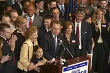 His campaign focused on balancing the federal budget, strict crime laws, and establishing relations with North Korea.[54] His candidacy was not expected to succeed in winning the Republican nomination due to the overwhelmingly large number of social conservatives in the Republican Party. He was, however, able to gain support. Fellow Pennsylvania Senator Rick Santorum was supportive of his candidacy.[55] Other supportive Republicans were hopeful Specter could trim the party's "far-right fringe". Although his campaign was ultimately unsuccessful at wooing conservatives, it was widely believed he could have had a strong showing among independents. On November 23, 1995, before the start of the primaries, Specter suspended his campaign to endorse Kansas Senator Bob Dole.