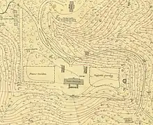 Construction began in 1803, eleven years after L'Enfant's Plan for the future "Federal City" (later called "Washington City", then Washington D.C.) had designated an area directly across the Potomac River to be the site of the "President's House" (later called the "Executive Mansion", now the White House) and the "Congress House" (now the United States Capitol). Custis located the building on a prominent hill overlooking the Georgetown-Alexandria Turnpike (at the approximate location of the present Eisenhower Drive in Arlington National Cemetery), the Potomac River and the growing Washington City on the opposite side of the river.[8] The mansion was built using materials on site, though the building was interrupted by the War of 1812 (and material shortages after the British burned the American capital city). The Custis mansion's exterior was completed in 1818.[10]