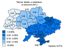 Many Armenians living in Ukraine have been Russified with about half speaking Armenian as their mother tongue but over 43% speaking Russian and only 6% Ukrainian.[7]