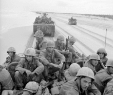 Many APCs are amphibious, meaning they are able to traverse bodies of water. To move in water they will often have propellers or water jets, or be propelled by their tracks. Preparing the APC to operate amphibiously usually comprises checking the integrity of the hull and folding down a trim vane in front. Water traverse speed varies greatly between vehicles and is much less than ground speed. The maximum swim speed of the M113 is 3.6 mph (5.8 km/h),[4] about 10% its road speed, and the AAVP-7 can swim at 8.2 mph (13.2 km/h).