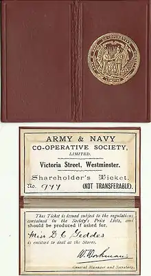 The Army & Navy Co-operative Society Ltd. was incorporated on 15 September 1871, being formed by a group of army and navy officers. The aim of the co-operative was to supply goods to its members at the lowest remunerative rates, and was based on two earlier models – the Civil Service Supply Association and the Civil Service Co-operative Society.[3] The society leased part of a distillery premises in Victoria Street, London which was owned by Vickers & Co, and by February 1872 a store for the sale of groceries was opened on the site. By 1873, the store offered stationery, drapery, fancy goods, tailoring, groceries, a chemist and even a guns department. The store proved too small for the growing business so the founding members rented a house next to their existing warehouse and acquired a further warehouse in Johnson Place.[3]