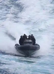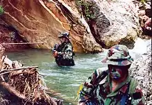 The Officer Commanding the Army Ranger Wing is responsible for the administrative, disciplinary and operational control of the unit, and is in turn directly under the command of the Chief of Staff at Defence Forces Headquarters (DFHQ).[21] Information on the numerical strength of the unit and the identity of its personnel is restricted.[22][23][24] Estimates variously put the strength at "well over a hundred" or between 140 and 150 personnel.[25][26][9] In 2015, the Defence White Paper announced an increase in strength with reports of the unit doubling in size.[26][7][27] The Wing is divided into operational task units each comprising several assault teams relative to each operator's area of speciality.[28][29][30][1] After serving one year in an assault team an operator can apply to join a specialist team such as combat diving team, free fall parachuting team and sniping team.[31][32] An example of an operational task unit is the Special Operations Maritime Task Unit (SOMTU).[32][33] Support platoons provide expertise in bomb disposal, medical treatment, maritime and aviation operations. The Army Ranger Wing is headquartered at the Defence Forces Training Centre (DFTC) in the Curragh Camp, with Army Rangers required to live within a defined radius.[25] Training is carried out nationwide at a number of Department of Defence properties, including Lynch Camp in Kilworth, County Cork.[34]