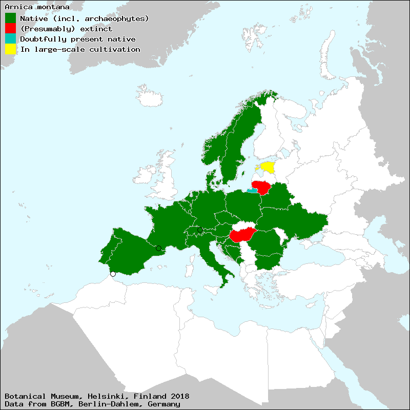 Arnica montana is widespread across most of Europe.[10] It is absent from the British Isles and the Italian and Balkan peninsulas.[11] In addition, it is considered extinct in Hungary and Lithuania.[11] Arnica montana grows in nutrient-poor siliceous meadows or clay soils.[8] It mostly grows on alpine meadows and up to nearly 3,000 m (9,800 ft). In more upland regions, it may also be found on nutrient-poor moors and heaths. However Arnica does not grow on lime soil,[8] thus it is an extremely reliable bioindicator for nutrient poor and acidic soils. It is rare overall, but may be locally abundant. It is becoming rarer, particularly in the north of its distribution, largely due to increasingly intensive agriculture and commercial wild-crafting.[12] Nevertheless, it is cultivated on a large scale in Estonia.[11]
