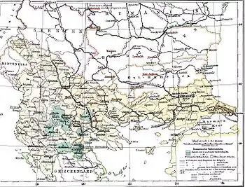 The Aromanians are a unique ethno-linguistic group, having their own culture and language, who have existed for over two thousand years in the Balkan peninsula.[1] They were for centuries considered a traditional mountain people and soon the word Vlach became synonymous with animal-husbandry and herdsmanship throughout the Balkans.[2] Although traditionally live-stock herders many began to emigrate to larger cities in the 16th and 17th centuries. Many Aromanians who fled from Moscopole and the nearby mountainous Gramos region also helped develop Kruševo (Crushuva) and Bitola (Bituli, Bitule) into large prosperous cities. Shepherds of the Pelister region near Bitola used to herd huge flocks of sheep from the summer pastures on Pelister (Pilister) to the winter lowlands near Ghevgelia, Giannitsa and Salonica (Sãruna). Typical Aromanian goods were cheese, meat, wool and wool garments, leather, rugs and carpets. Many Aromanians also entered the rug and carpet trade by selling kilimi and flocati. A part of Aromanians adhered to the Bogomil faith around the 10th and 11th centuries and contributed to the spread of Bogomilism in Herzegovina[3] Wealthier Aromanians established themselves in Bitola and Štip (Shtip) as inn-keepers, artisans, caravan traders and merchants. An Aromanian market (Macedonian: Vlaška čaršija) was established in Bitola's Aromanian quarter. The Aromanian presence is still present in Bitola to this day.