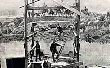 The Hungarian press constantly reported on the progress of the work. They predicted that the painting would be completed by August 20, 1893 (August 20 is the national day of Hungary, commemorating the canonization of King Saint Stephen of Hungary on August 20, 1083). Seeing the public's interest, the council of Budapest paid the costs. In the contract they named a Budapest location for the painting.[5] Feszty wasn't able to finish in time for the August 20 holiday; as of August, only a small color draft was ready (the final painting is enormous, at 15×120 meters). In April, with the aid of Ignác Újváry, he painted the sky. Landscape details were painted by László Mednyánszky, Újváry and Spányi. The people were painted by Pál Vágó and Henrik Papp, and the camps by Celesztin Pállya. More painters joined the work, as it was too much for Feszty and his companions to finish without help. Several writer, actor and musician friends entertained the painters as they worked.[5]