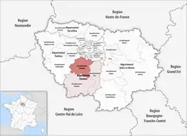 The arrondissement of Palaiseau is an arrondissement of France in the Essonne department in the Île-de-France region. It has 68 communes.[1] Its population is 620,608 (2016), and its area is 484.0 km2 (186.9 sq mi).[2]