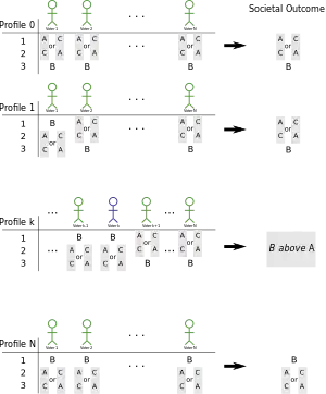 An N-tuple (R1, …, RN) ∈ L(A)N of voters' preferences is called a preference profile. In its strongest and simplest form, Arrow's impossibility theorem states that whenever the set A of possible alternatives has more than 2 elements, then the following three conditions become incompatible: