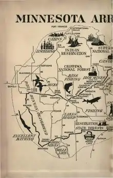 A 1929 map titled "The Arrowhead of Minnesota" illustrates a stylized representation of important aspects in Northeastern Minnesota history, including geology and iron mining. It was published by the Hibbing branch of the American Association of University Women.