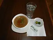 Arroz caldo, also spelled Aroskaldo, is a Filipino rice and chicken gruel heavily infused with ginger and garnished with toasted garlic, scallions, and black pepper. It is usually served with calamansi or fish sauce (patis) as condiments, as well as a hard-boiled egg. Most versions also add safflower (kasubha) which turns the dish characteristically yellow. Arroz caldo is also known as pospas in Visayan regions, though pospas has slightly different ingredients.