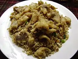 Arroz chaufa also known as Arroz de chaufa (Chinese rice) is a Chinese-Peruvian fried rice dish. It is a chifa style dish, a Chinese cuisine.[1] It consists of a mix of fried rice with vegetables, usually including scallions, eggs, and chicken, quickly cooked at a high flame, often in a wok with soy sauce and oil. It is derived from Chinese cuisine due to the influx of Chinese immigrants to Peru.
