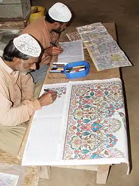 ![]() Two convict artists draw designs of carpets on graph paper at Industrial Workshops of Central Jail Faisalabad, Faisalabad, Pakistan, in 2010 | |
