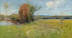 About the same time, Streeton met the artist Charles Conder, who travelled down from Sydney in October 1888 at the invitation of Tom Roberts. One year Streeton's junior, Conder was already a committed plein airist, having been influenced by the painterly techniques of expatriate impressionist Girolamo Nerli. Conder and Roberts joined Streeton at Eaglemont in January 1889 and helped make some modest improvements to the house. Despite austere living conditions, Streeton felt content: "Surrounded by the loveliness of the new landscape, with heat, drought, and flies, and hard pressed for the necessaries of life, we worked hard, and were a happy trio."[7] Streeton and Conder quickly became friends and influenced one another's art. Their shared love of South Australian poet Adam Lindsay Gordon's lyrical verse is revealed in the titles of some of their Eaglemont paintings, including Streeton's romantic gloaming work ′Above us the great grave sky′ (1890, taken from Gordon's poem "Doubtful Dreams"[11]). Later, critics would describe some of the pair's Eaglemont paintings as companion pieces, as both artists often painted the same views and subjects using a high-keyed "gold and blue" palette, which Streeton considered "nature's scheme of colour in Australia".